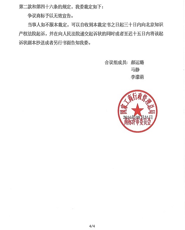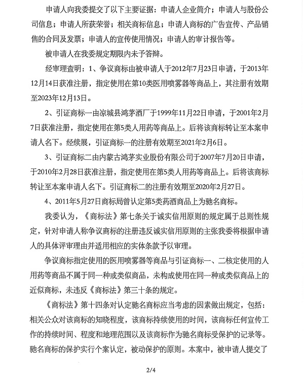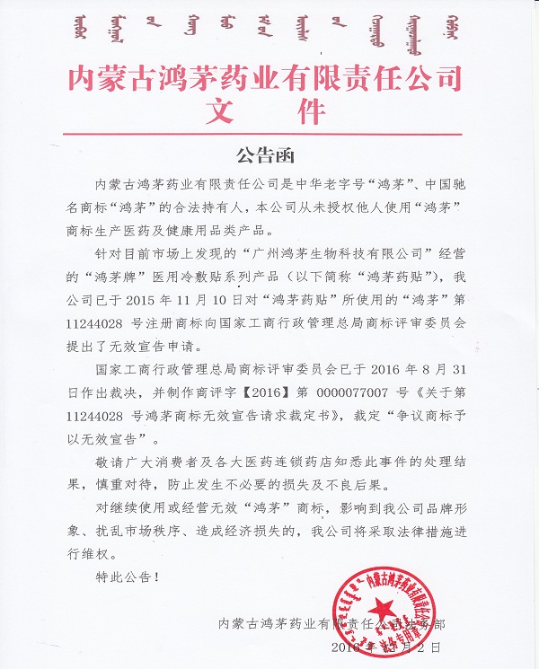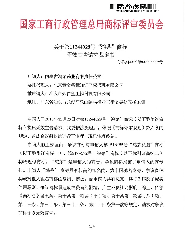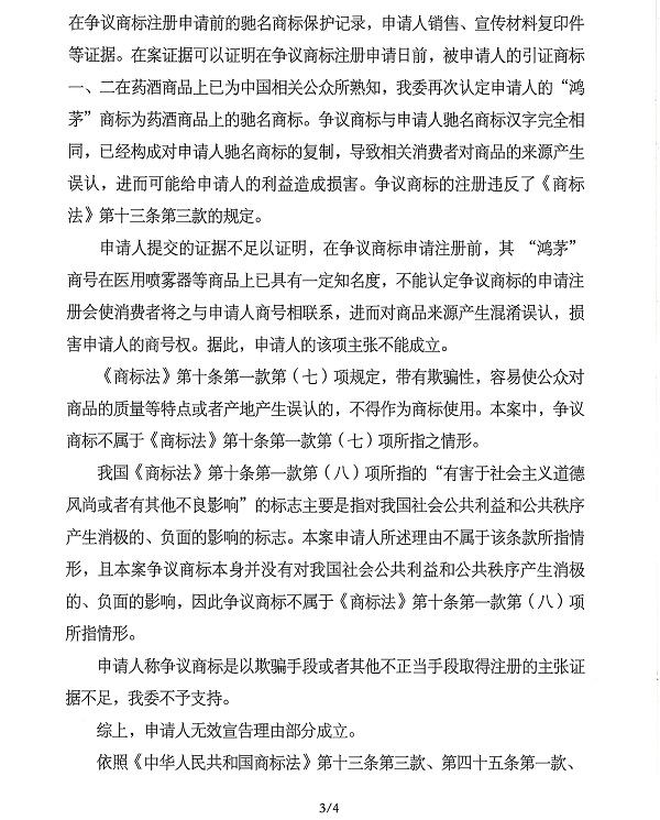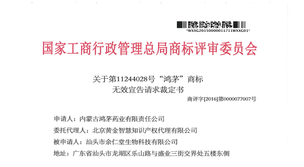 關于“鴻茅”商標無效宣告請求裁定書
